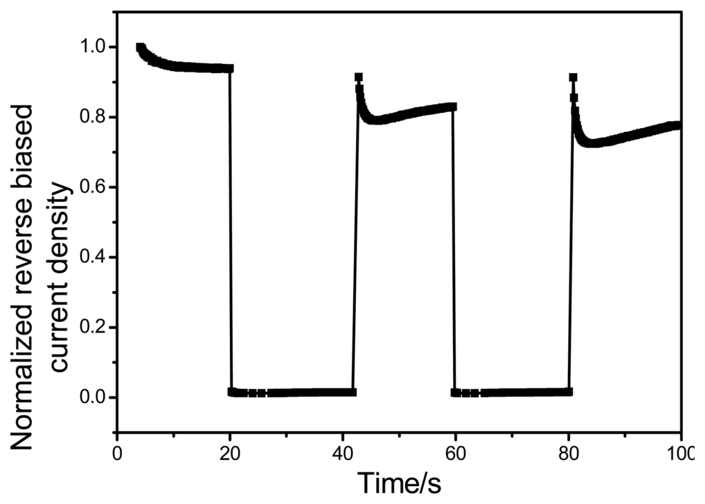 The temporal response is another important parameter of the photodetector and is determined by the average exciton lifetime in photoactive film. Reasonably fast response times can be achieved by incorporating thinner photoactive films in OPDs [38]. The fabricated OPD demonstrates a sharp change in its magnitude of photocurrent in response to periodic pulsed simulated solar light (irradiance ∼100 mW/cm2, pulse width equals 20 s) as shown in Figure 7. The presented sensor has been investigated as a whole visible light detector, therefore a solar simulator has been used to impinge whole visible spectrum on the sensing area instead of a monochromator. The photodetector was externally biased at −3 V, while probing the time dependent photoresponse characteristics as a function of light modulation ON/OFF. As explained in the photocurrent generation mechanism earlier, when light impinges on the active film it causes a progressive rise of the photocurrent amplitude by virtue of photogenerated charges. The resulting time-resolved photocurrent response is gradual, stable and repeatable as evidenced by three successive cycles of abrupt switching between ON and OFF states of illumination. The initial photocurrent spike observed during light exposure is due to the momentary surge in illumination level, which is commonly observed when a halogen bulb is switched on. As the illumination level of the bulb stabilizes to 100 mW/cm2, photocurrent also tends to stabilize after the momentary initial spike. For our present OPD, in response to sudden light irradiation, the photocurrent density progressively increased from ∼−0.168 nA/cm2 to −0.330 mA/cm2. The normalized transient reverse biased photocurrent behavior has been depicted in Figure 7. The time required for the photocurrent to increase from 10% to 90% of the final settled value or vice versa is generally defined as the rise and decay time (tr and td), respectively [39]. Figure 7, reveals the operation speed of OPD, in present case the rise time (tr) is about 800 ms, and fall time (tf) is 500 ms. For reference, typically the response times for bulk heterojunction based OPDs are in the order of (10−8 to 10−3) s [40]. Similar fast response time are observed in the case of inorganic photodiodes, Liu et al. for instance, reported response time on the order of microseconds for photodiode based on high quality ZnO epitaxial films on sapphire substrates [41]. It is worth noting that the ternary blend based photodetector exhibited fast response and recovery times as compared to binary blend based devices previously reported by our group (refer to Table 1). The repeatability and reproducibility of the response/recovery time measurements were investigated for five devices and similar robust stability and reproducibility in response has been observed.