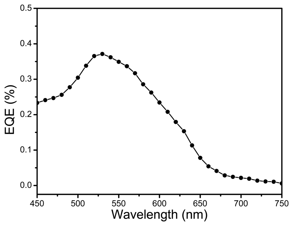 Figure 8 depicts the external quantum efficiency (EQE) spectrum for the fabricated OPD. The EQE spectrum was obtained by using a xenon lamp (150 W Oriel), a monochrometer and with the help of a calibrated Si-photodetector. It can be inferred from the spectrum that the ternary blend helps to enhance the light utilization efficiency of the active film, which is vital for improved sensing parameters. EQE spectrum matches well with the visible absorption spectrum. Compared to the absorption spectrum of the ternary blend, the photocurrent from 450 nm to 650 nm is mainly due to the two donor materials i.e., MEH-PPV and PFO-DBT. Light harvesting at shorter wavelength i.e., near 450 nm is mainly contributed by MEH-PPV phase whereas at higher wavelengths, PFO-DBT phase contributes more towards light harvesting. The photosensitivity spectra of the binary blend based photodetectors of MEH-PPV-PCBM and PFO-DBT-PCBM have already been investigated by Zhou et al. [23]. It can be cross-referenced that the EQE spectrum of the ternary blend covers the detection range from 450 nm to 650 nm which consist of the sensitivity range of the both photodetectors i.e., MEH-PPV-PCBM and PFO-DBT-PCBM.