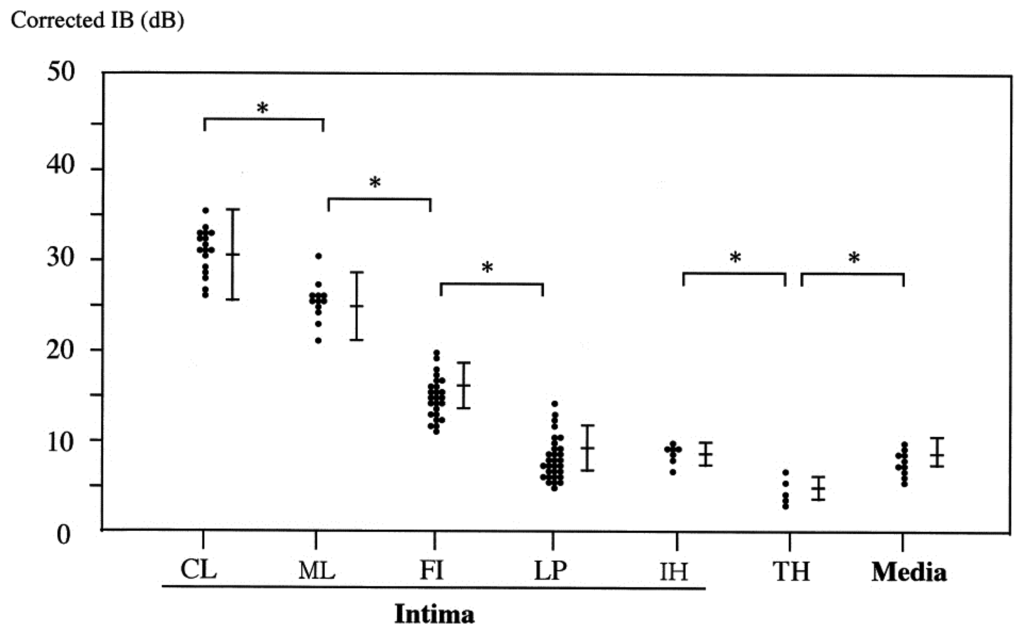 Therefore, when the difference in acoustic characteristic impedance between medium and target is greater, the ultrasound IB power ratio becomes greater. With the ultrasound technique, part of the ultrasound energy returns to the transducer after reflection from tissue, and the ultrasound energy produces an electrical impulse. With the IB ultrasound technique, the IB values for each tissue component are calculated using a fast Fourier transform, and expressed as the average power, measured in decibels (dB), of the frequency component of the backscattered signal from a small volume of tissue. In contrast, the amplitude of the ultrasound signal is converted into gray-scale images without a fast Fourier transform using the conventional ultrasound technique [11].