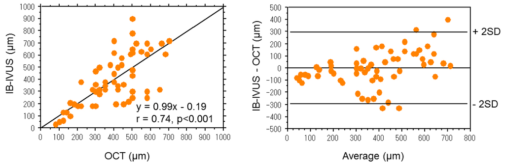 The thickness of fibrous cap measured by IB-IVUS was significantly correlated with that measured by OCT in the same coronary segments (Figure 5) [13]. The mean difference between the thickness of fibrous cap measured by IB-IVUS and OCT (IB-IVUS—optical coherence tomography) was −2 ± 147 μm (Figure 6). OCT has a better potential for characterizing tissue components located in the near side from the vessel lumen, whereas IB-IVUS has a better potential for characterizing the tissue components of entire plaques.