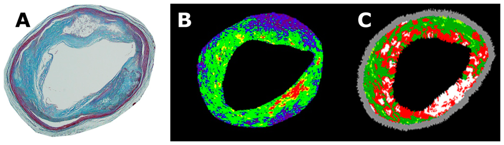 - Kawasaki, M.; Takatsu, H.; Noda, T.; Ito, Y.; Kunishima, A.; Arai, M.; Nishigaki, K.; Takemura, G.; Morita, N.; Minatoguchi, S.; et al. Non-invasive tissue characterization of human atherosclerotic lesions in carotid and femoral arteries by ultrasound integrated backscatter: Comparison between histology and integrated backscatter images. J. Am. Coll. Cardiol. 2001, 38, 486–492. [Google Scholar]