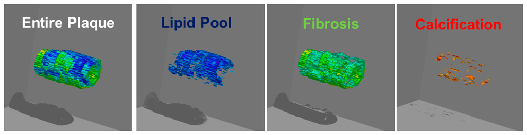 Several large clinical trials demonstrated that lipid-lowering therapy with 3-hydroxy-3-methylglutaryl coenzyme A reductase inhibitors (statins) reduces cerebrovascular events [29,30]. The IB techniques provide useful clinical information on the effects of statins. The relative lipid volume in carotid plaques measured by IB values significantly decreased in the statin therapy group after 6 months, whereas lipid volume did not change significantly in the diet group [31]. For more comprehensive plaque analysis using IB-IVUS, three-dimensional IB-IVUS offers the potential for quantitative volumetric tissue characterization of coronary atherosclerosis [32] (Figure 8).