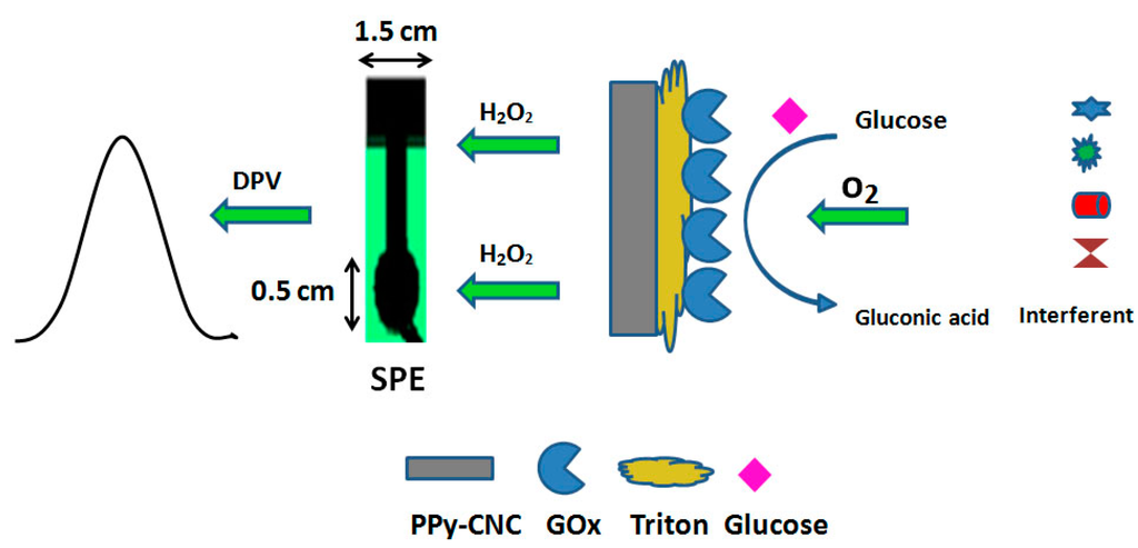 Finally, 5 µL of triton-x 100 (0.5 wt% in water) was used to prevent enzyme leaching from the surface of the electrode and was allowed to dry at 25 °C. Subsequently, the electrodes were washed with a PBS solution before any measurements to remove the unbound enzyme from the PPy/CNC surface. The electrode of SPE/PPy/GOx was prepared using the same method for comparison. The schematic view of LbL method for deposition of GOx on the PPy/CNC substrate is shown in Figure 1.