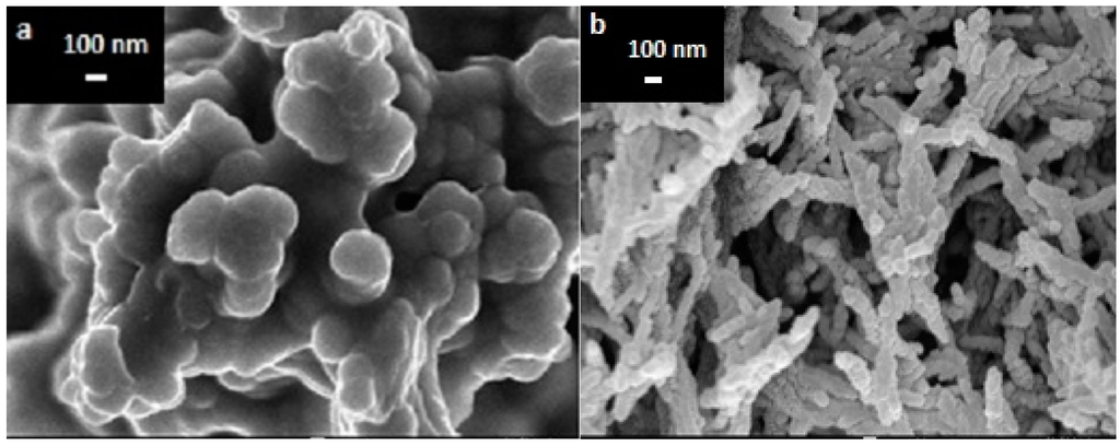 Microstructure of (a) PPy and (b) the porous PPy/CNC nanocomposite modified on the SPE surface.