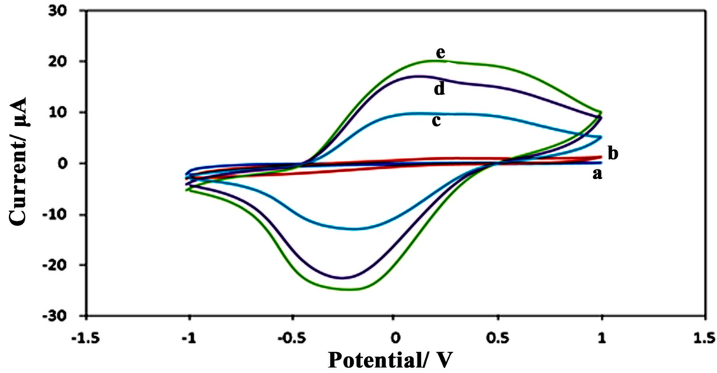 Cyclic voltammetry graphs of the unmodified bare SPE (a); the modified PPy/GOx electrode (b); and the PPy/CNC/GOx electrodes prepared using different concentrations of CNC of 0.3 (c); 0.5 (d); and 0.9 wt% (e).
