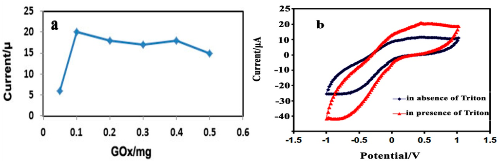 The effect of Triton on the SPE modified electrode performance was studied using 0.5% Triton X-100 solution. As it can be seen from Figure 4b, the modified electrode covered with triton showed higher current response compared to the modified electrode without triton at 0.36 V indicating Triton X-100 being able to prevent GOx leaching from the surface of electrode.