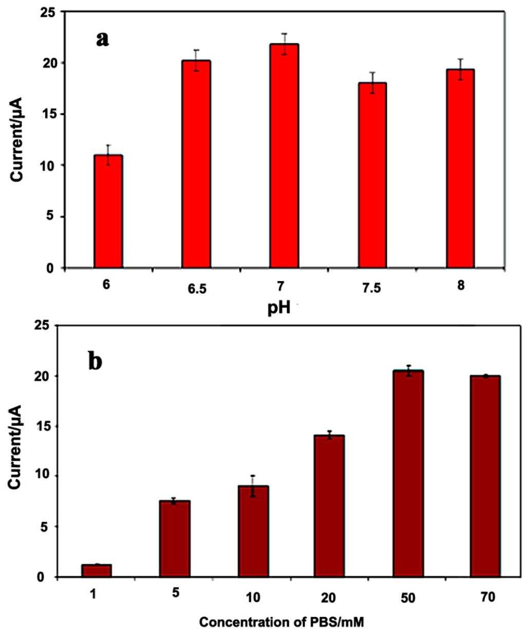 To enhance the electrocatalytic activity of the sensor toward glucose, the modified electrodes were optimized with PBS solution with different capacities ranging from 1.0 to 70 mM and different pHs within the range from 6.0 to 8.0. The pH of the solution effects the GOx activity [45]. From Figure 5a, it can be observed that the maximum response is approached at a pH of 7.0. Because the isoelectric point of GOx is 4.2, it carries a net negative charge at pH = 7 [46]. The electrostatic interactions between the negatively charged enzyme and the positively charged polypyrrole matrix at a pH of 7, results in an increased adsorption and incorporation of the enzyme into the nanostructure, resulting in a higher sensitivity at this pH.