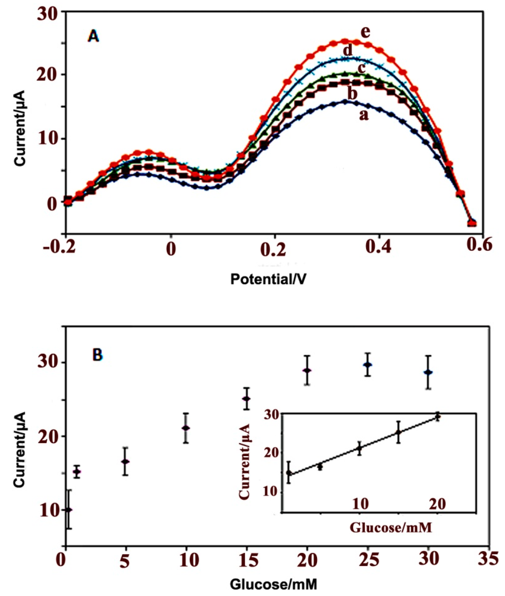 The O2 consumption and the H2O2 production increased during the reaction upon successive additions of glucose. No significant signals were observed for the sample tested in the absence of glucose [50]. Increasing the glucose concentration by more than 20 mM showed no effect on the biosensor response.