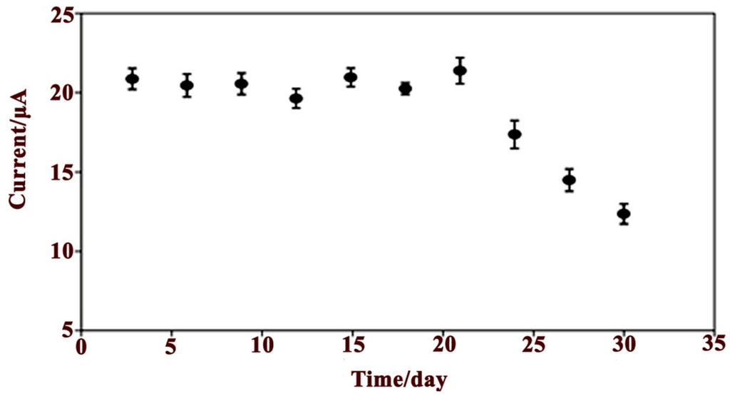 The shelf life and storage stability of the glucose biosensor was tested during a period of one month in the presence of a 10 mM glucose solution with PBS (0.05 M, pH 7.0) and is shown in Figure 7.