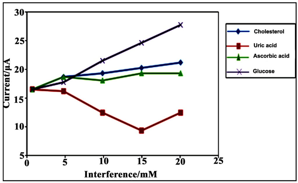 The separate solution method (SSM) has been used to investigate the effect of interference on the glucose biosensor response. The measurement of interference based on the SSM method was performed in a glucose solution and interfering species, including cholesterol, uric acid (UA) and ascorbic acid (AA), separately in PBS (50 mM, pH = 7.0). The concentration of the interfering species utilized the boundaries of the linear response range from 1.0 × 10−3 to 2.0 × 10−2 M [53]. As shown in Figure 8, after the addition of interfering species, there was no obvious increase in the current response of the glucose biosensor.