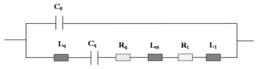 where f0 is the resonance frequency of bare mQCM, A is the piezoelectric active crystal area; µq and ρq are the elastic modulus and density of quartz, respectively. Figure 1 shows the equivalent circuit of a coated mQCM in liquid phase. The motional inductance (Lq) relates to the mechanical vibration inertia of quartz vibration process. The motional capacitance (Cq) corresponds to the mechanical elasticity and motional resistance Rq equivalent to the energy losses in the vibration process. The static capacity (C0) is formed from dielectric quartz substrate between the two electrodes when there is no vibration. Its value is related to the geometric size of the quartz and electrode area.