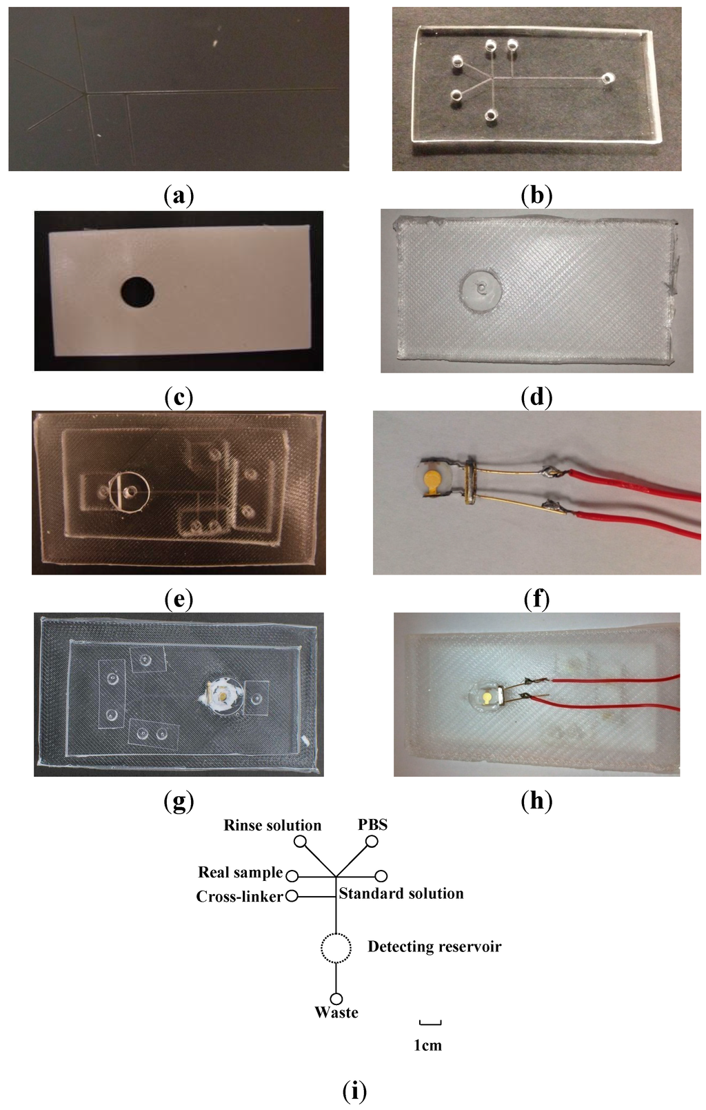 Photographs of (a) Si mold; (b) ABS mold; (c) PDMS microfluidic chip; (d) mounting PDMS slab; (e) PDMS-PDMS microfluidic device; (f) mQCM; (g) front-side and (h) backside of PDMS-mQCM microfluidic system; (i) Layout of an integrated PDMS-mQCM microfluidic system; standard solution: from 0.025 µM to 5.2 µM Aβ42. Scale bar: 1 cm.