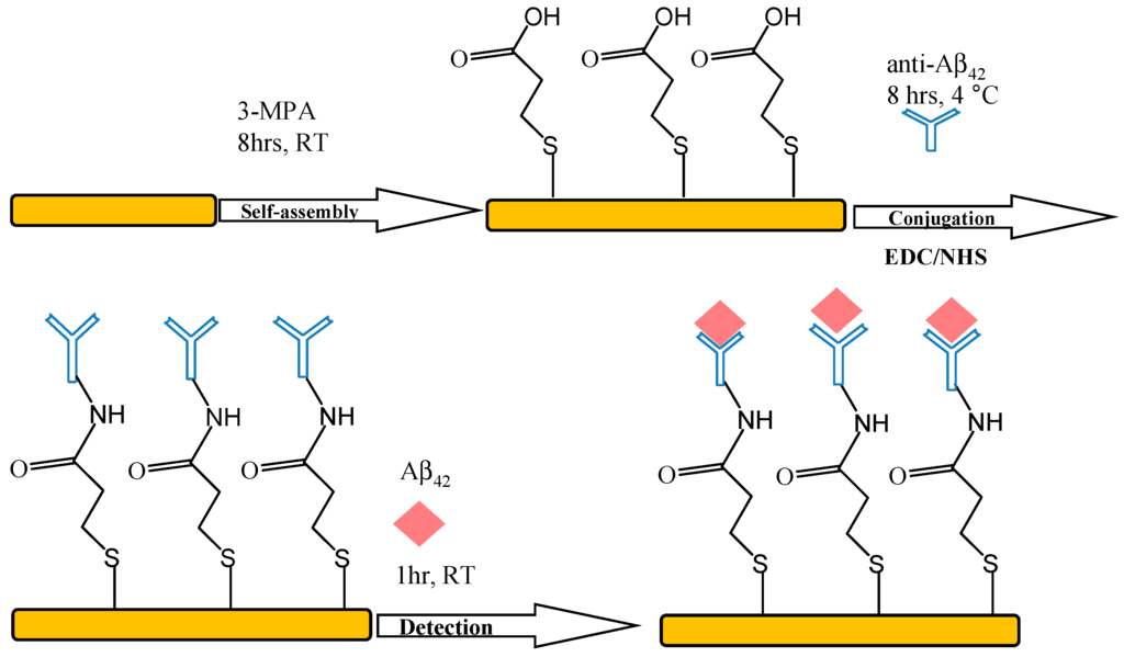 Schematic representation of the immobilization process for Aβ42 antibody and detection of Aβ42.