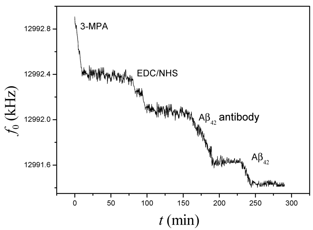A cross-linker method was adapted for Aβ42 antibody immobilization. Five mM 3-MPA solution was injected into the detection reservoir of the PDMS-mQCM microfluidic device for 8 h. Then the reservoir was rinsed with ethanol and water. Next 20 mM phosphate buffer solution (PBS, pH 7.0) containing 24 mg/mL EDC and 6 mg/mL NHS was injected into the reservoir and incubated for 1 h. The channels and reservoirs were rinsed with PBS afterwards. 2 µM Aβ42 antibody in PBS was then injected into the reservoir and incubated for 12 h at 4 °C, and rinsed with PBS thoroughly to remove the absorbed. Then the defective sites were blocked with 10 µM BSA in PBS. A schematic representation of these processes is shown in Figure 3.