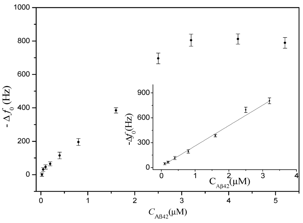 Determination of Aβ42 in PBS with different concentrations from 0.025 µM to 5.2 µM was conducted on the PDMS-mQCM microfluidic device. Results are shown in Figure 5. A linear range from 0.1 µM to 3.2 µM was found. The regression equation was obtained as follows: Δf0(Hz) = −246.15 × CAβ42(nM) − 14.44, with a correlation coefficient of 0.991.