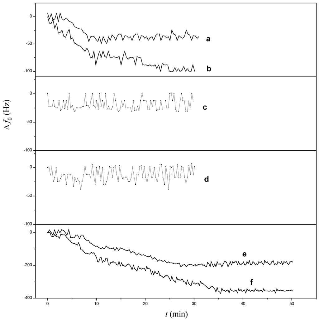 where ΔRt and ΔLt are the changes in total resistance and total inductance, respectively. Lqa is the motional inductance for mQCM sensor in air. f0 can be used approximately in the calculation instead of f with an error below ca. 0.3%, because the f value is hard to obtain. Accordingly, if the experimental responses of ΔRt, Δf0 and ΔLt satisfy Equation (2), then the frequency shift (Δf0) should be governed by variation in the density and viscosity of local solution near mQCM sensor surface. Otherwise, mass change is the effective factor [].