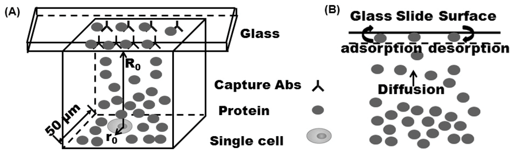 In microengraving immunoassay, when proteins are secreted from a single cell, they first diffuse from the cell surface to a sublayer of the glass slide surface. The sublayer of the glass slide surface is theoretically treated as an imaginary plane (dashed line in Figure 1B), which is a few molecular diameters below the interface. At the initial stage, the surface of the glass slide tends to be an empty site. Then, proteins diffused to the sublayer of the glass slide adsorb directly onto it while also achieving correct orientation (Figure 1B). The glass slide surface becomes occupied with protein adsorption. The probability that proteins will bind to a more crowded site is also increased. Desorption will take effect and back diffusion from the sublayer to the bulk solution must then also be considered. Depending on the rates of diffusion and kinetic association and dissociation, the dynamic protein adsorption process can be limited by (1) molecular diffusion of proteins to the sublayer of glass slide, these cases are referred as diffusion-controlled; (2) surface kinetic adsorption or binding, these cases are defined as kinetic controlled; (3) both steps of diffusion and kinetic adsorption under mixed diffusion-kinetic mechanism.