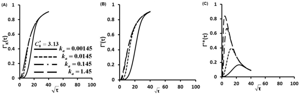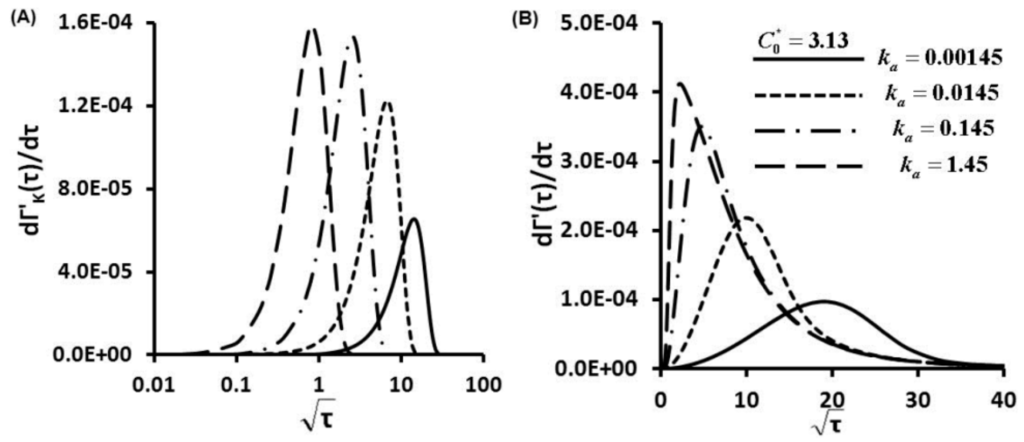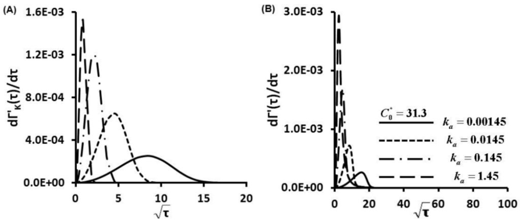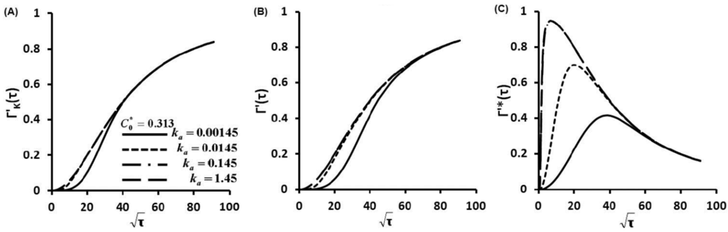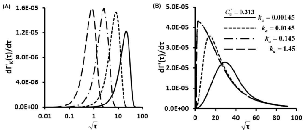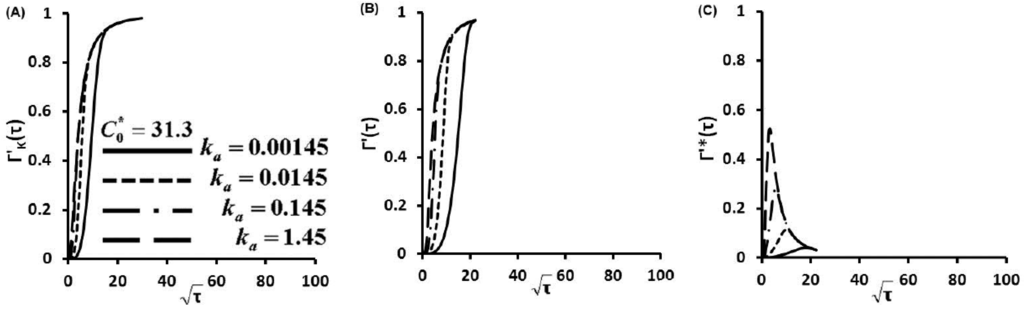 At the early stage, the protein adsorption rate increases with the square root of nondimensional time ) in an approximately linear correlation till reaching peak values (Figure 5B, Figure 6B and Figure 7B). Protein adsorption behaviors within this stage show similar trends in diffusion controlled cases. The diffusion mechanism is dominant at this stage, then transport mechanism switches over to kinetic controlled when maximum adsorption rates are attained. At fixed , the highest protein adsorption rate is achieved at the highest secretion rate (the highest and also the highest ). Then, protein adsorption rates decay in an exponential manner till reaching equilibrium values. The differences between the maximum become more notable with increase of as illustrated from Figure 5B to Figure 7B. Transport mechanism in protein adsorption dynamics shifts earlier at higher (also higher secretion rates), as indicated by decreased adsorption rates after reaching the turning points (peaks of Figure 5B, Figure 6B and Figure 7B).