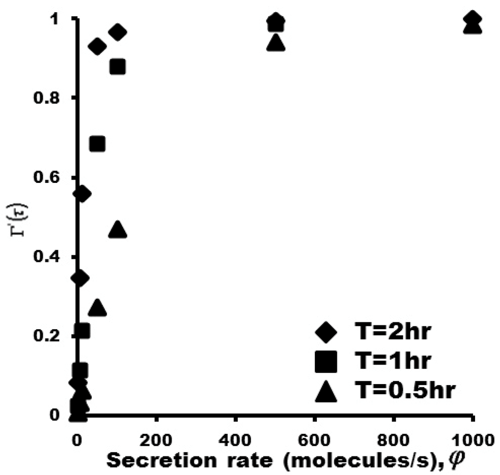 Concentration of protein at sublayer is normalized with protein concentration at the single cell’s surface . Magnitudes of increase with time and approach to 1 eventually. At fixed , magnitudes of are also influenced by the secretion rates. The higher secretion rates, the higher . This also results in higher , and faster approaching of the to 1. The differences within at different secretion rates become more notable with the increase of from 0.313 to 31.3 (Figure S2).