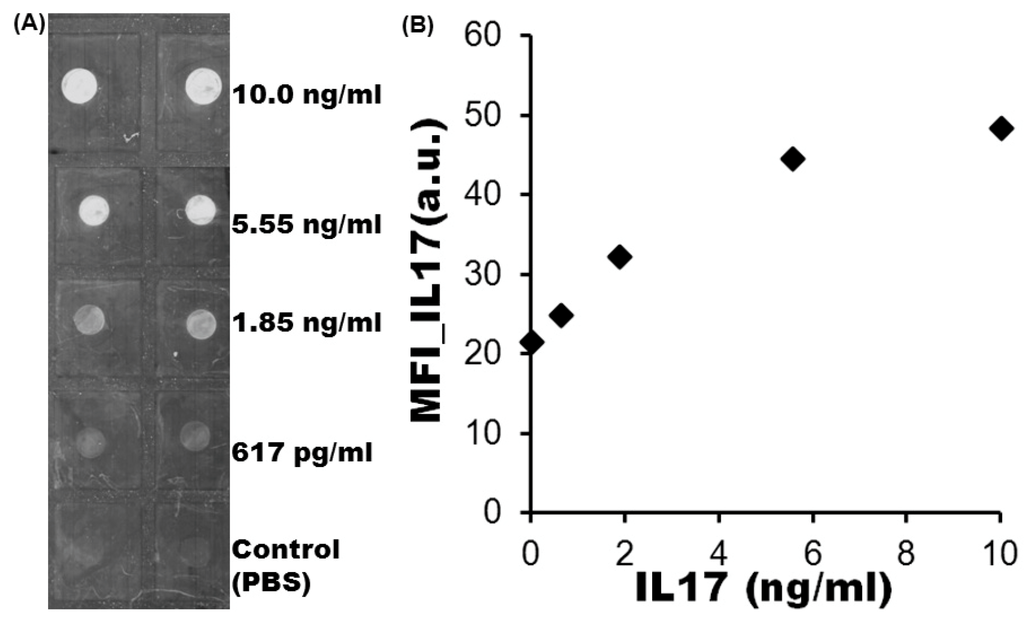 Recombinant interleukin 17 (IL17) and monoclonal antibodies used to capture IL17 were purchased from eBioscience (Minneapolis, MN, USA). Affinity-purified polyclonal antibodies for detecting IL17 (eBioscience) were labeled by conjugating the antibodies with NHSester activated fluorescent dyes, and purified by spin column (Invitrogen, Carlsbad, CA, USA). The average degree of labeling using the commercial kits was 3–4 dyes per antibody.