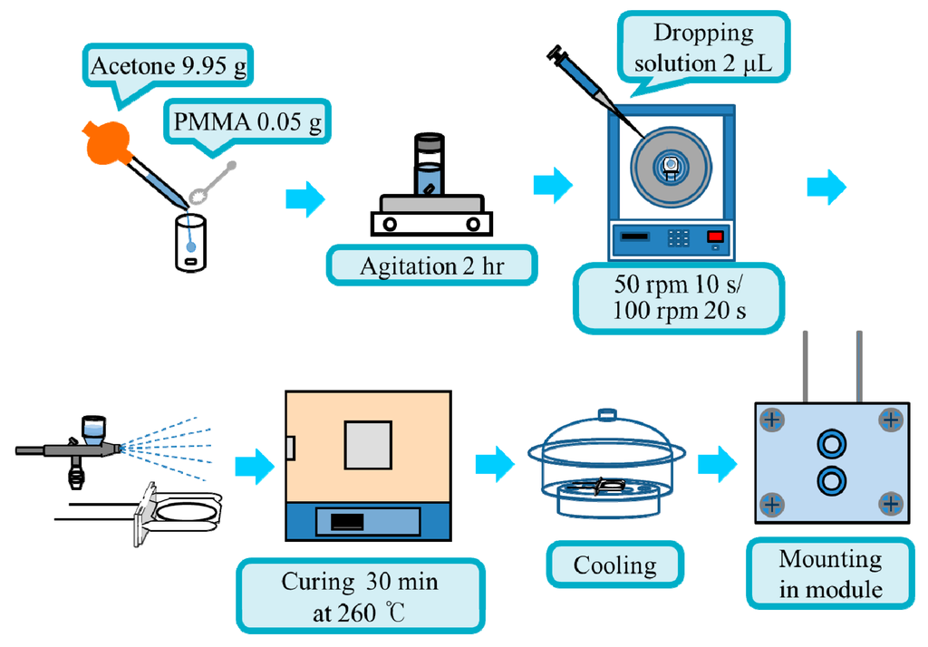 The PMMA (0.05 g) was dissolved in acetone (9.95 g) in a beaker, and the mixture was agitated for 2 h for complete dissolution. Because the top plate cannot hold the QCM, a specially designed silicone rubber holder was utilized in the spin coating. A QCM was placed in the holder, and the holder was set in the center of the top plate of the spin coater. When the coater was ready, the PMMA solution (2 μL) was dropped on the electrode and the coater was activated. The spinning was for 10 s at 50 rpm followed by 20 s at 100 rpm. After the binder was spread on the electrode, the zeolite powder was sprayed on the electrode using an air brush with mild air flow. The coated resonator was cured in an oven of 260 °C for 30 min to make the powder bind on the electrode. The QCM preparation procedure is illustrated in Figure 1. After cooling in a desiccator, the QCM was mounted in the cell module.