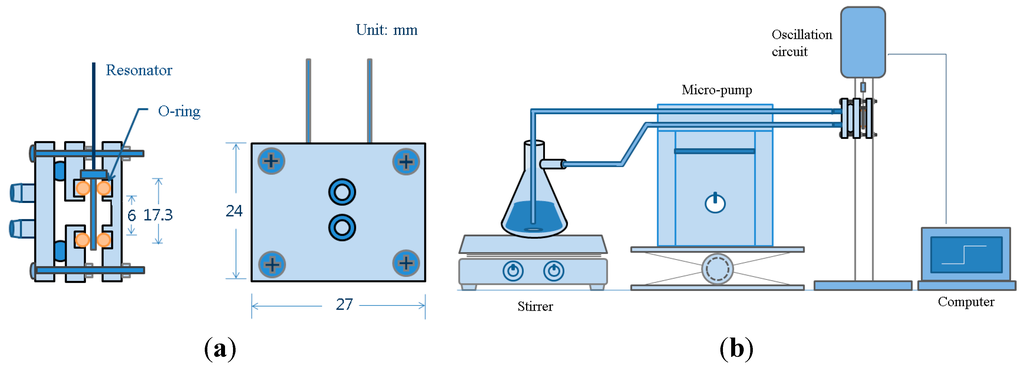 The cell module holding the QCM was built with polypropylene plates as shown in Figure 2a. The thickness of three plates was 5 mm. There are two cells—one for the ethanol sample and the other for QCM mounting. The leftmost plate has two nipples for ethanol flow. Three o-rings were placed between the plates avoid ethanol leakage. The size of the plates was 27 mm by 24 mm. Four screws tightened the plates.