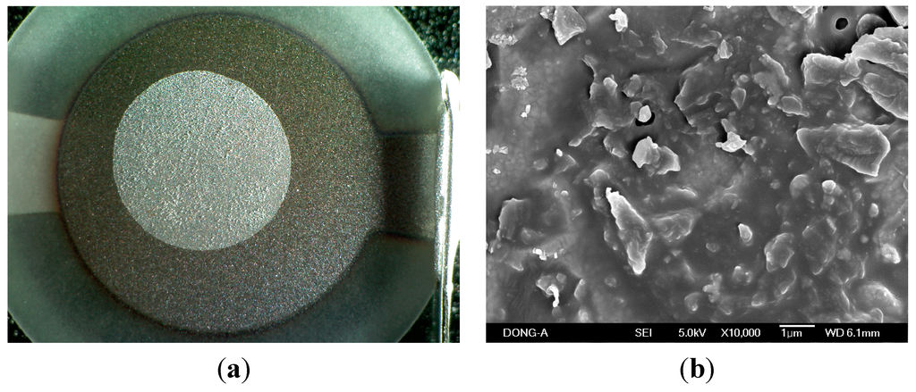 Photographs of the QCM surface by (a) Optical microscope; (b) Scanning electron microscope (×10,000 times). In image (a), the outer circle with connection path on the right-hand side is the silver electrode, and white inner circle demonstrates the PMMA coating. The center of the QCM is more sensitive than the outer area.