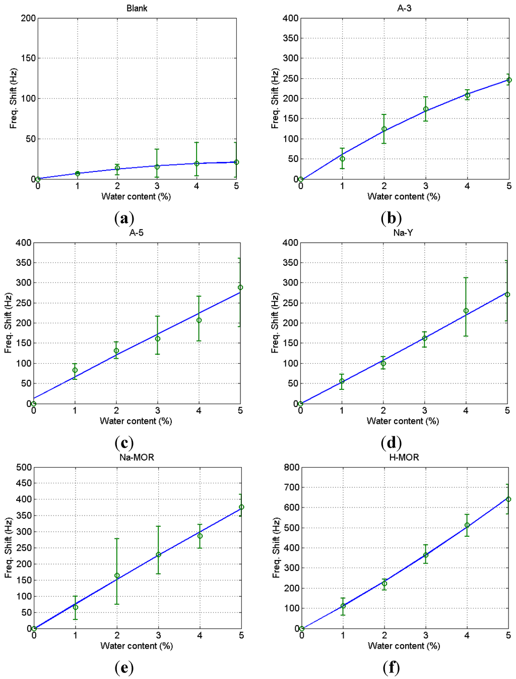 Frequency shifts of blank QCM (a) A-3 coated QCM; (b) A-5 coated QCM; (c) Na-Y coated QCM; (d) Na-MOR coated QCM; (e) H-MOR coated QCM; (f) At different water contents.