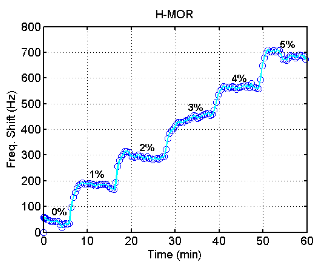 Figure 5 shows the temporal variation of frequency shift of the H-MOR coated QCM at different water contents. Though there is baseline drift in the measurements, the increase of water content gives a significant change of the frequency shift. For comparison among the different zeolites, the frequency shift of all QCMs used in this study is displayed in Figure 6.
