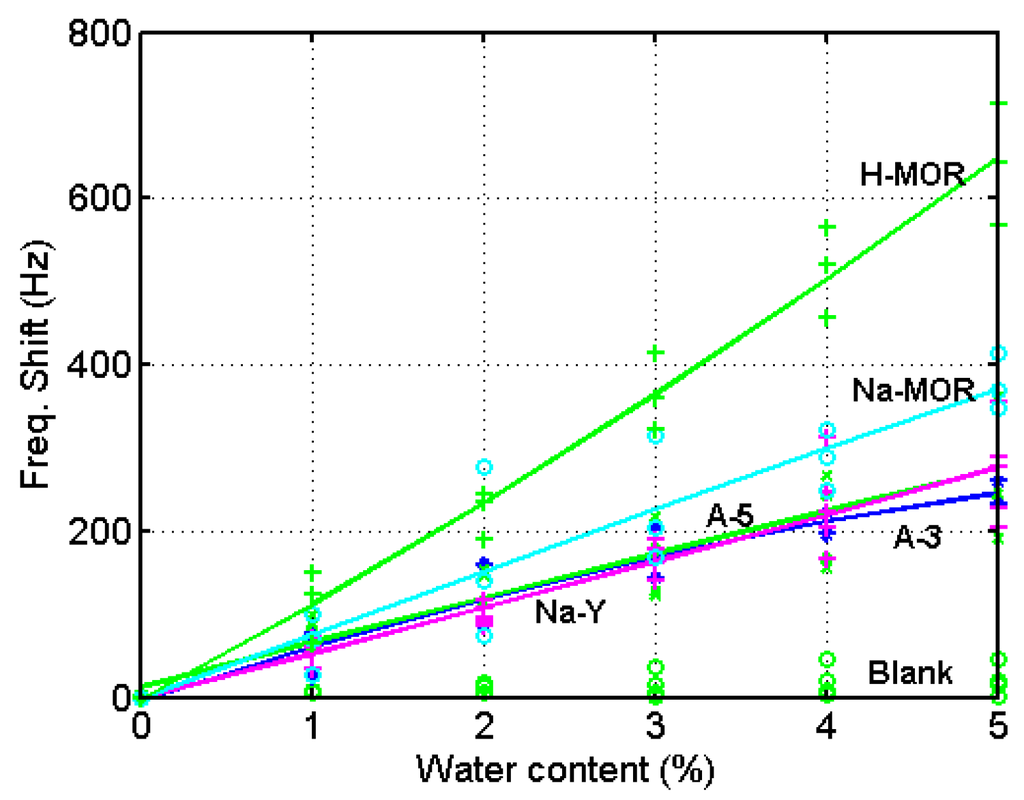 To examine the effect of the bare QCM and binder on the water adsorption in the zeolites, blank tests were conducted with the PMMA-only coated QCM. Figure 4a shows the frequency drop with the increase of water content in ethanol. The line connecting the circles indicates the 2nd order fitted curve of the experimental data. The average values of drop of the blank QCM at a given water content were deduced from the measurements of the zeolite-coated QCM. Because the zeolite used in the experiments was commercially developed for the use in ethanol dehydration, potential contaminants in the ethanol of commercial production do not affect the water adsorption performance in this study. The water adsorption with the A-3 coated QCM is shown in Figure 4b. The rigid attachment of zeolite of mass change to the crystal surface due to the adsorption of water causes a decrease of frequency in the resonant frequency [30]. The increase of frequency drop with the elevation of water content indicates that the zeolite coating works for the detection of water content in ethanol. Though the variation of measurements was slightly large at low and middle water contents, less variation was observed at high contents. Contrarily the variation of measurements was large with high contents in the measurement with the A-5 coated QCM as illustrated in Figure 4c. The amount of variation at a certain water content, the sensitivity, is similar for the A-3 coated and A-5 coated QCMs. A similar measurement of frequency drop was yielded with the Na-Y coated QCM as plotted in Figure 4d, but large variation was observed at high content of water. An improvement of sensitivity was obtained with the Na-MOR coated QCM as demonstrated in Figure 4e. About 37% of the sensitivity improvement was found compared to the previous three QCMs. The best performance was yielded with the H-MOR coated QCM, in which almost 230% of improvement was achieved over the first three QCMs as shown in Figure 4f. When the performance improvement was compared to the molecular composition of the zeolite, it was found that the molecular ratio of silicon to aluminum affects the sensitivity of water adsorption. The highest ratio of silicon in H-MOR gives the best performance, while the adsorption surface area and pore volume do not affect the sensitivity of the water detection. There was some deviation in the measurement of water content in ethanol using the zeolite-coated QCM, but all five kinds of zeolites showed an increase in frequency drop as the water content increased. Especially the H-MOR coated QCM lead to the highest sensitivity with small variation in the measurement. The best limit of detection (LOD) was obtained from the H-MOR, which was 0.1% considering the variance of the measurement. This limit of concentration measurement is considered acceptable for process control use in industrial applications.