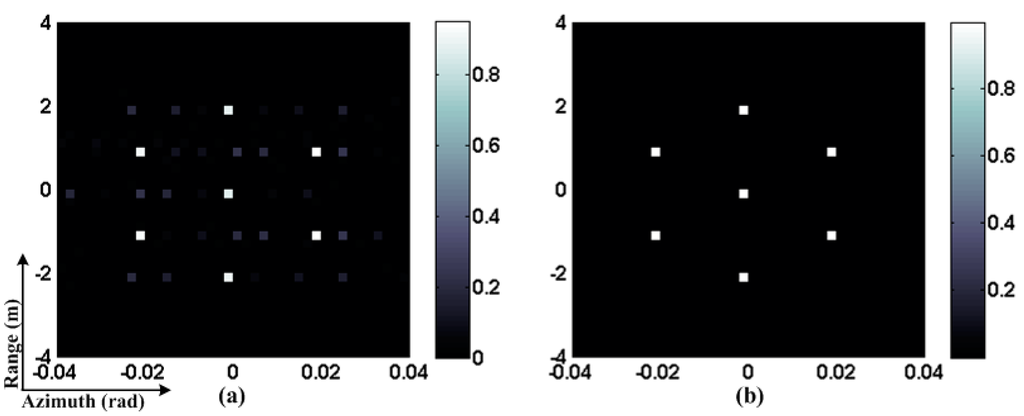 In this section, simulations are carried out to verify the proposed sparse auto-calibration RCI method. An X-band RCI radar system with carrier frequency of 10GHz is considered. The transmitters are configured as a uniform linear array with and inter-element spacing . The transmitters emit independent frequency-hopping waveforms with the bandwidth of 500 MHz. A range-azimuth imaging plane, covering 8 m × 0.08 rad, is discretized to 40 × 40 grid-cells. The gain and phase errors are randomly varying at and [−45°,45°], respectively. We initialize , , and η = 10−3. For the scattering coefficient vector , we use the conventional OMP as our initialization of the proposed method.
