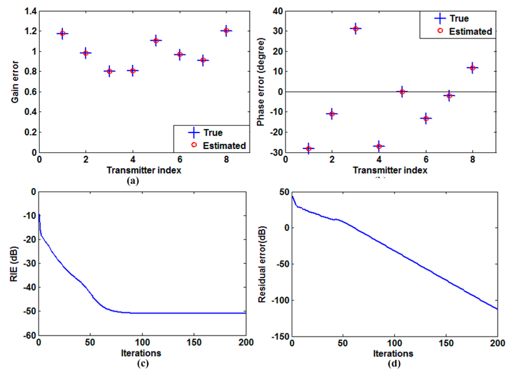 As shown in Equation (31), the sequence is decreasing and converges. Furthermore, the proposed method consists of two types of iterative procedure. For the target reconstruction step, the conventional OMP is used. The OMP algorithm is an iterative process and its convergence is analyzed in many literatures. For the gain-phase error estimation step, it is an unconstrained optimization problem which is solved by the Newton’s method whose convergence is guaranteed by the property of Newton method [19]. Consequently, the method is convergent in terms of the cost function.