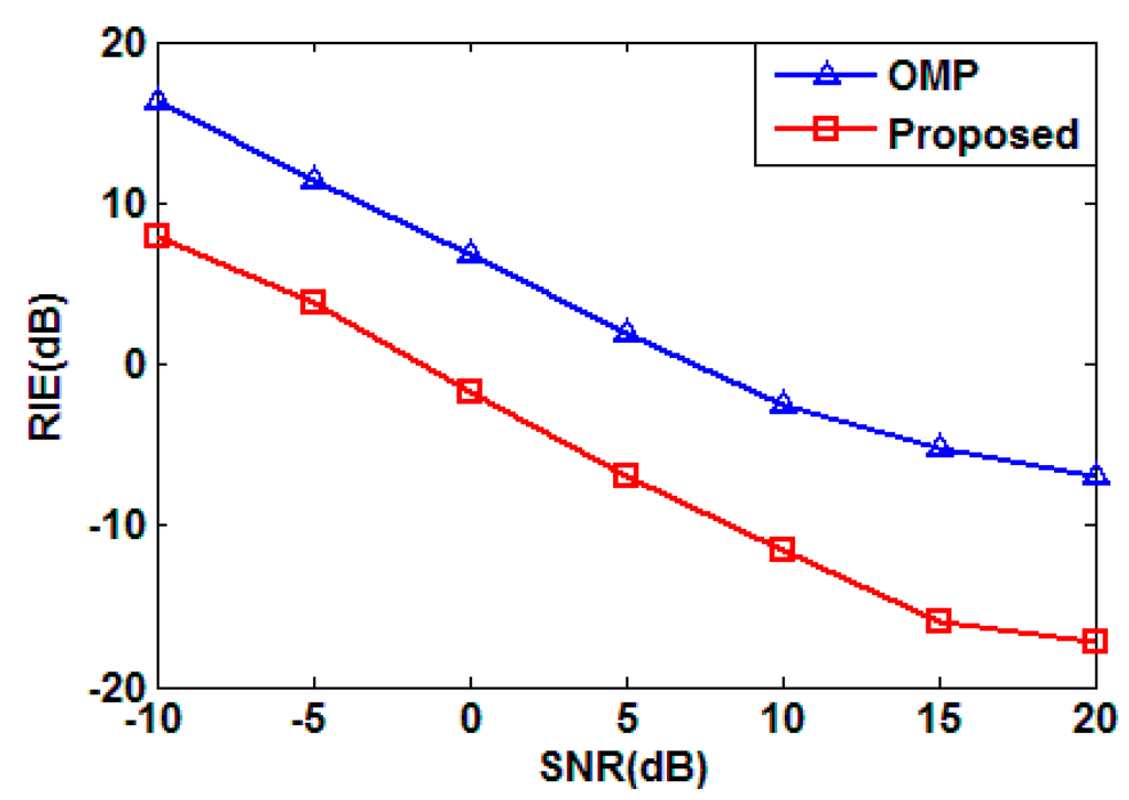 Note that the above simulation is conducted without noise. Then, we test RIEs under different SNRs, for the proposed method and conventional OMP algorithm, the result is shown in Figure 4. As shown in the figure, the imaging quality is improved significantly as the SNR increases, which means the proposed method is sensitive to noise. While compared with OMP, the proposed method improves the imaging performance by more than 8 dB from the RIE perspective.