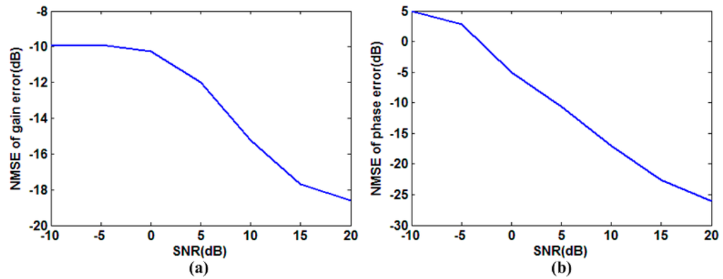Gain-phase error estimation performance for various SNRs. (a) NMSE for gain error estimation versus SNR; (b) NMSE for phase error estimation versus SNR.