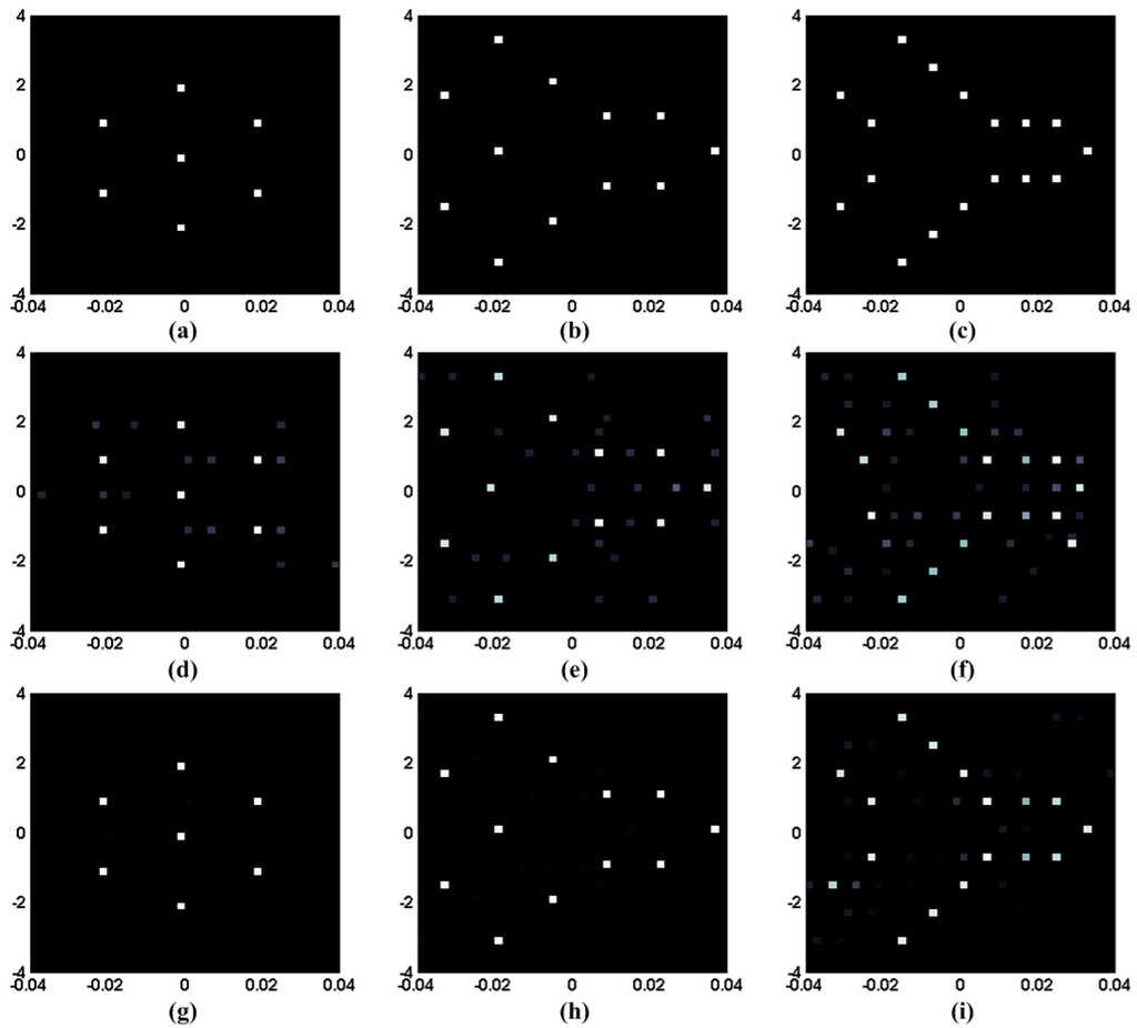 RCI results for different target scenes. (a–c) Three different target scenes; (d–f) Imaging results of OMP for the three target scenes; (g–i) Imaging results of the proposed method for the three target scenes.