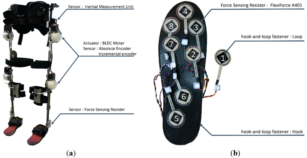 The appearance and sensor configurations of ROBIN-H1. (a) ROBIN-H1 lower limb exoskeleton robot and its hardware configuration; (b) Insole-type foot sensor configuration. Eight FSRs are inserted between the upper and lower insoles. The placement of each FSR is determined and adjusted according to the foot size and shape of the wearer before using the robot.