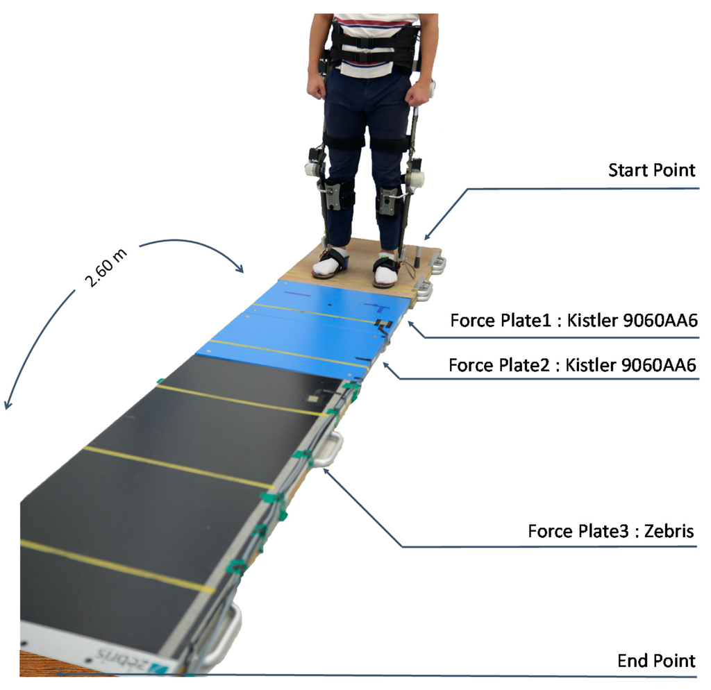 Configuration of the environment for the walking experiments. Total walking length from start point to end point was 2.60 m. Three force plates were used to acquire ground reaction forces while walking. The subjects start walking at the start point and end walking at the end point while maintaining a standing posture.
