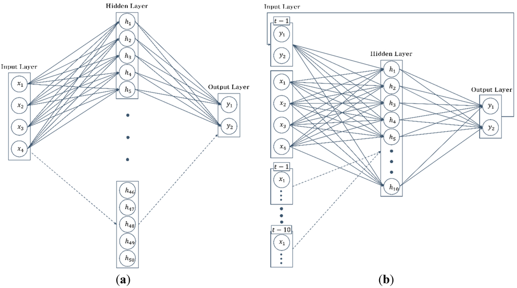 Growing network model (structure) of neural networks. (a) MLP-based network, with an increasing number of nodes in the hidden layer. The number of nodes increases from 5 to 50 nodes; (b) NARX-based network with an increasing number of nodes in the input layer as the input time delay increases from 1 to 10. Each input time delay has four nodes.