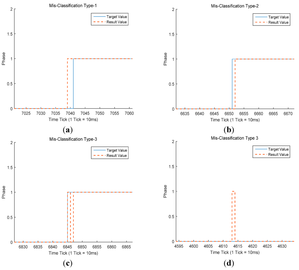 - The classifier considers the gait phase to have changed, but no transition has occurred in the real gait phase (Misclassification Type-3, Figure 4c,d).