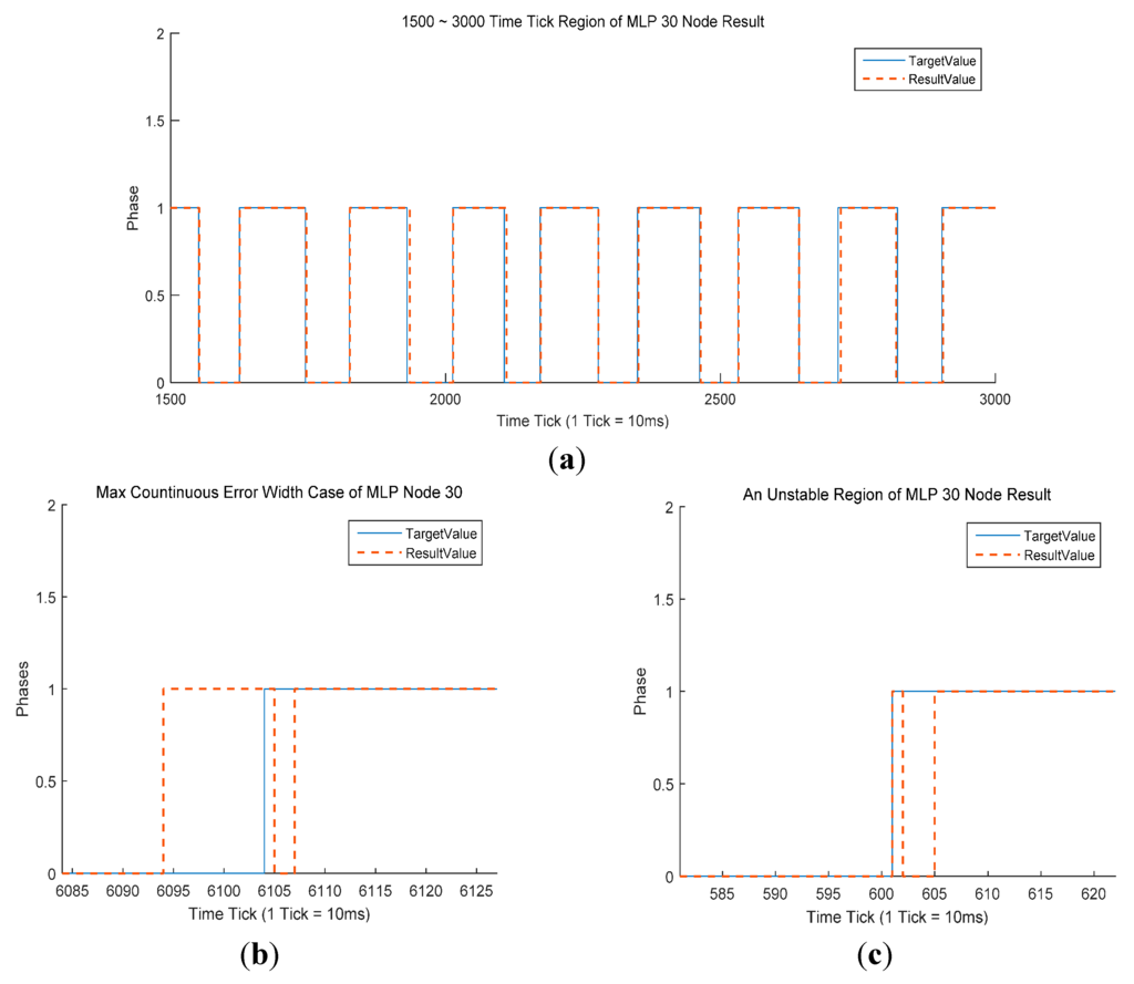 (a) Comparison of results and target value for the MPL with 30 nodes over frames 1500–3000. The blue line denotes the target value acquired by the force plates. The orange dotted line denotes the classification result of the MLP with a 30-node classifier, the best MLP-based classifier; (b) Max continuous error width for the MLP with 30 nodes; (c) An unstable region for the MLP with 30 nodes.