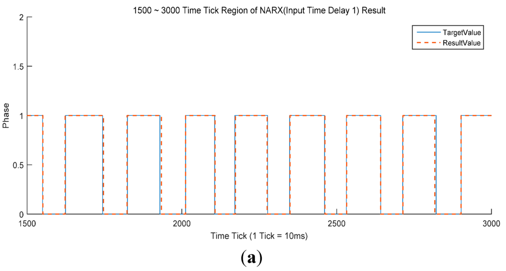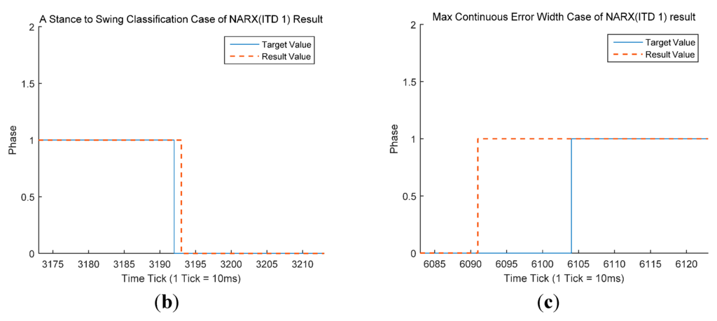 There does not appear to be any significant difference in CSR between the MLP-based and NARX-based (97.05%) classifiers (Table 3). The NARX-based classifiers gave a slightly larger maximum continuous error width and a slightly lower mean continuous error width than the MLP-based classifiers, but the differences were small. The most dramatic difference is in the number of unstable regions. In the NARX case, there are no unstable regions. This suggests that the NARX-based classifiers are more acceptable to exoskeleton robots than MLP-based classifiers. The best NARX-based classifier was that with a single input time delay (Figure 6). This classifier had a CSR of 97.95%, the best of all the MLP and NARX classifiers. In addition, this classifier had the lowest mean continuous error width and Std. However, the maximum continuous error width of 12 was somewhat large. The NARX-based classifiers also exhibited worse overall performance in the swing to stance case (Figure 6b,c).