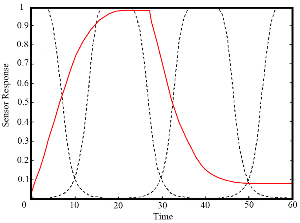 and represent the processed maximum value feature and the original maximum response value of the of the i-th sensor to the j-th gas, respectively. The difference method can usually eliminate the additive errors, which are added both to the baseline and the steady-state response (meaning the response of the i-th sensor to the j-th gas). There is some evidence that the relative and fractional difference are helpful to compensate for the temperature influence on the sensors and the fractional difference linearizes the mechanism that generates a concentration dependence in metal oxide chemiresistor sensors [47]. The log difference is more suitable when the variation of the concentration of the odor is very large because it is able to linearize the highly nonlinear relationship between odor concentration and the sensor output. The normalization models, which limit each sensor output between 0 and 1, thereby keep each element of the response vector at the same magnitude. Not only can it reduce the calculation error of stoichiometric recognition, but also is very effective when it is not the odor concentration which is of interest, but rather the precise identification of the odor. This method for example provides good recognition results for the discrimination of several types of coffee using neural networks [48].
