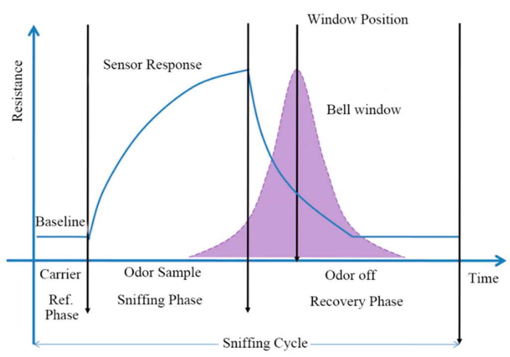 An electronic nose (E-nose) is an instrument which comprises an array of electronic chemical sensors with partial specificity and an appropriate pattern-recognition system, capable of recognising simple or complex odors. It is specifically used to sense odorant molecules in analogy to the human nose. However, the architecture of an E-nose also applies in gas sensing for the detection of individual components or mixtures of gases/vapours [1], which is playing an increasing role in general purpose detection of gases in many applications such as odor analysis [2,3,4], quality control of food industry [5,6,7,8,9,10], environment protection [11,12,13], public health [14,15,16,17,18,19], explosives detection [20] and spaceflight applications [21]. The main hardware component of an E-nose is an array of non-specific gas sensors, i.e., sensors that interact with a broad range of chemicals with varying strengths. Correspondingly, the analyte stimulates sensors in the array, which elicits a characteristic response called “fingerprint”. The main software component of an E-nose is its feature extraction and pattern recognition algorithms, which process the sensor characteristic response, extract and select useful information and realize the pattern recognition.