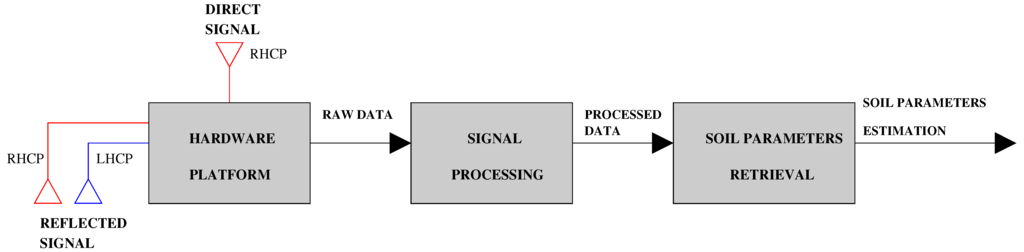 The first step is the definition of the hardware architecture, i.e., the RF front-end, the microprocessor board and the antennas. Then, the design of proper GNSS signal processing techniques follows, to detect and estimate the relative delay and the amplitude of the reflected GNSS signals. The major concern at this stage is the extreme weakness of the reflected signals, which may lose around 13 dB for the LHCP and 23 dB for the RHCP with respect to the direct signal [18], received at a nominal power on the order of −160 dBW. Finally, proper remote sensing algorithms post-process the raw GNSS data.
