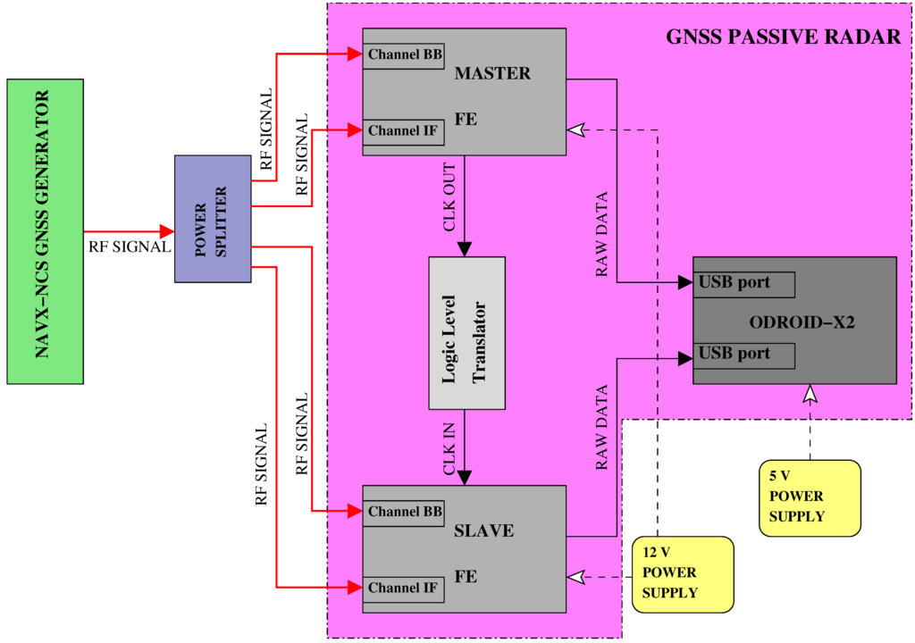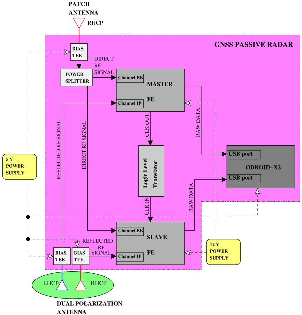 As indicated in Figure 2, a power supply of 5 V is employed for the ODROID-X2 and all of the antennas, while 12 V is used for the FEs in order to guarantee a proper functioning of the device, in particular the stability of the master clock. The bias-tees (BTs) allow a stable power supply to the antennas, while decoupling the DC from the RF signal entering the FE.