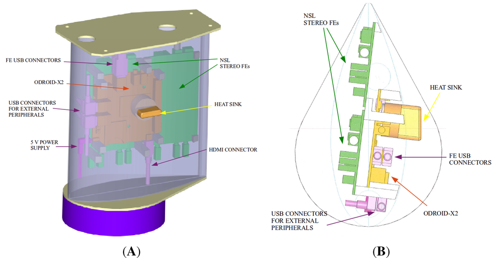 After the definition of the functional architecture, the system components were assembled inside a proper case. The authors already showed a preliminary assembled prototype in [27], but such a configuration implied a parallelepiped-shaped case, which was not the best in terms of aerodynamic performance. For this reason, the final sensor case was designed ad hoc in carbon fiber with a neutral wing profile, and the internal components were mounted accordingly. Some computer-aided design (CAD) views are reported in Figure 3. In particular, Figure 3A depicts the carbon fiber case in light violet, double-ended with two aluminum plates in grey. The bottom plate serves as the support for the nadir-oriented antenna, depicted by the dark violet cylindrical disk, while the top lid is designed to be screwed to a rectangular plate, called the trolley unit, which connects the sensor mechanically and electrically to the aircraft body. The trolley is specifically designed to be hosted in a structure (bay) composed of two rails and fastened externally to the lower part of the aircraft, for rapid boarding of the sensors. The bay can host 3–4 sensor carts boarded with a “plug-and-play” mechanism. The yellow object, which stands out from the case, acts as heat sink of the internal parts: in fact, it terminates with a cylindrical part directly in contact with the microprocessor of the ODROID-X2 board, depicted in orange. The two FEs in green are just behind the ODROID-X2. All of the boards are attached to the internal faces of the case by means of small resin supports. The chosen airfoil is better visualized in Figure 3B, where it is possible to observe how the internal components are placed, in order to optimize the available space.