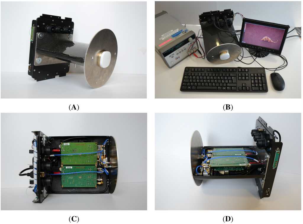 Once the carbon fiber case has been manufactured, the assembly of the sensor was completed. Figure 4 shows some pictures of the final version of the prototype. In particular, the carbon fiber case is well visible in Figure 4A,B: it is screwed to the nadir-oriented antenna at the bottom side, by means of a circular aluminum plate with the function of both support and ground plane, and to the trolley unit at the top side. Figure 4B shows the sensor under lab testing connected to an HDMI monitor, mouse, keyboard and external power supply. The case has been specifically designed in such a way as to be easily opened, for fast checks and maintenance service, as illustrated in Figure 4C,D, where internal components and connections are visible.