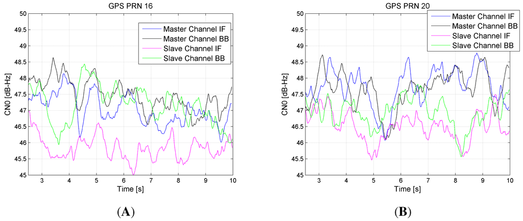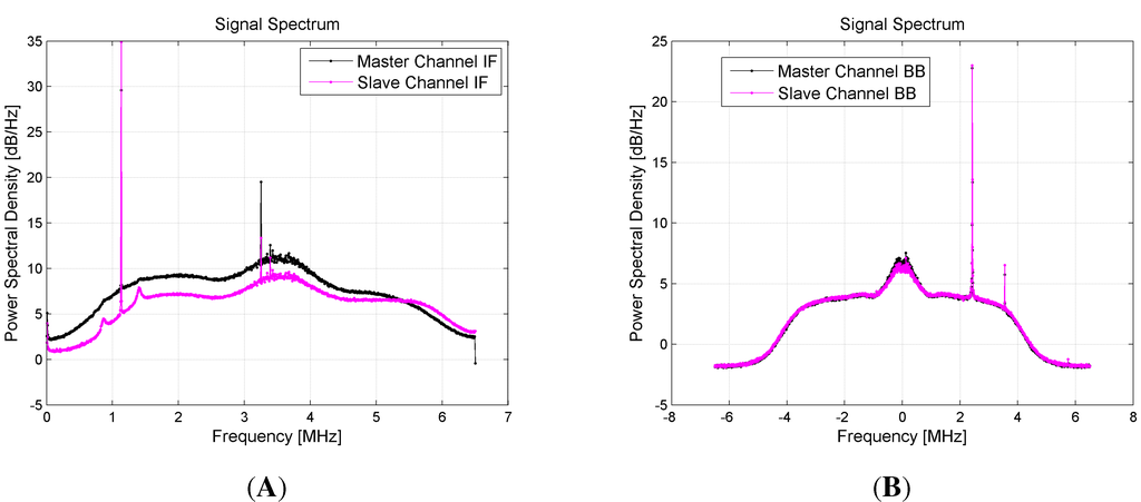 In Figure 7, another example of the in-lab test results is reported. Here, the estimated PSDs of the digitalized signals entering the FEs are shown: Channel IF signals in Figure 7A and Channel BB signals in Figure 7B. In particular, the black plot represents the master spectrum, while the pink one is the slave spectrum. The GPS signal is strong and well evident in the bandwidth center. From these results, a strong interferer at MHz respectively for Hz (BB) and MHz (IF) appears. This is probably due the FE clock, but being far from the GPS main lobe, no performance degradation is produced in the acquisition and tracking loop.