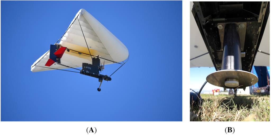 Designed and assembled in such a way, the sensor prototype dimensions resulted in being 200 mm mm mm (length × width × height) with a weight of less than 3 kg, including the nadir-pointing antenna with its ground plane, so as to be sufficiently light and compact to be mounted on-board UAVs and small aircraft. In particular, the target UAV belongs to the civilian category of remotely-controlled (RC) light UAVs, or more in general, light unmanned aircraft systems (UASs), with a maximum take-off mass (MTOM), including the fuel, of less than 150 kg and an autonomy of 1–2 h. Additionally, the manned airplane is a two-seat ultralight aircraft with fixed wings.