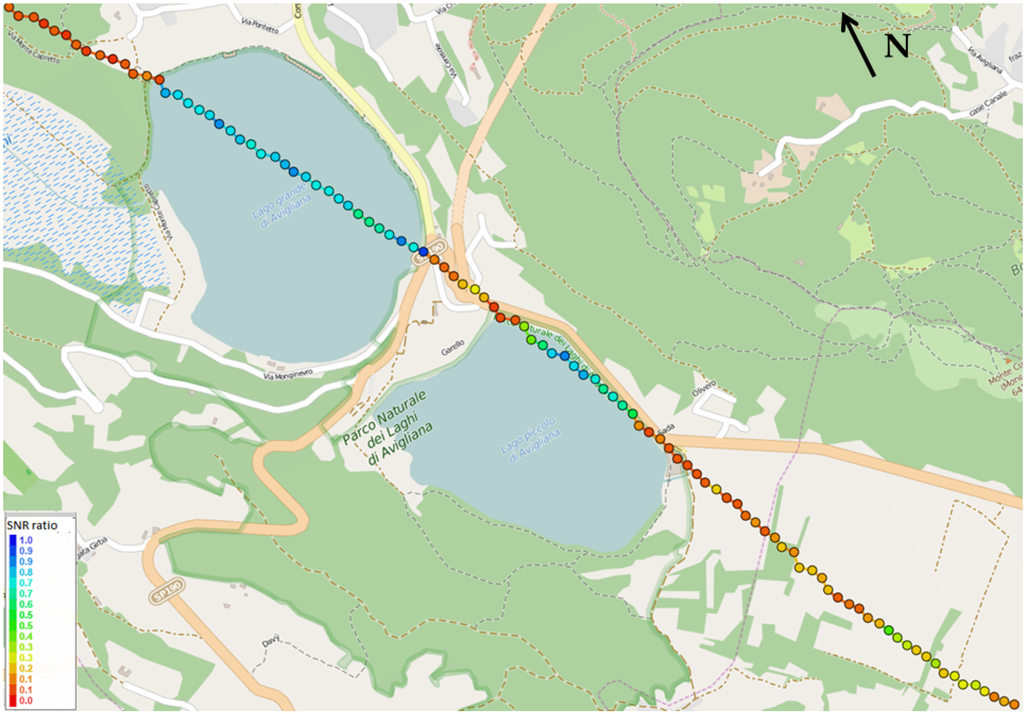 Specular points of PRN 30 over the Avigliana lakes. The color is proportional to the SNR ratio between the left-hand circular polarized (LHCP) reflection and the direct GPS signal.